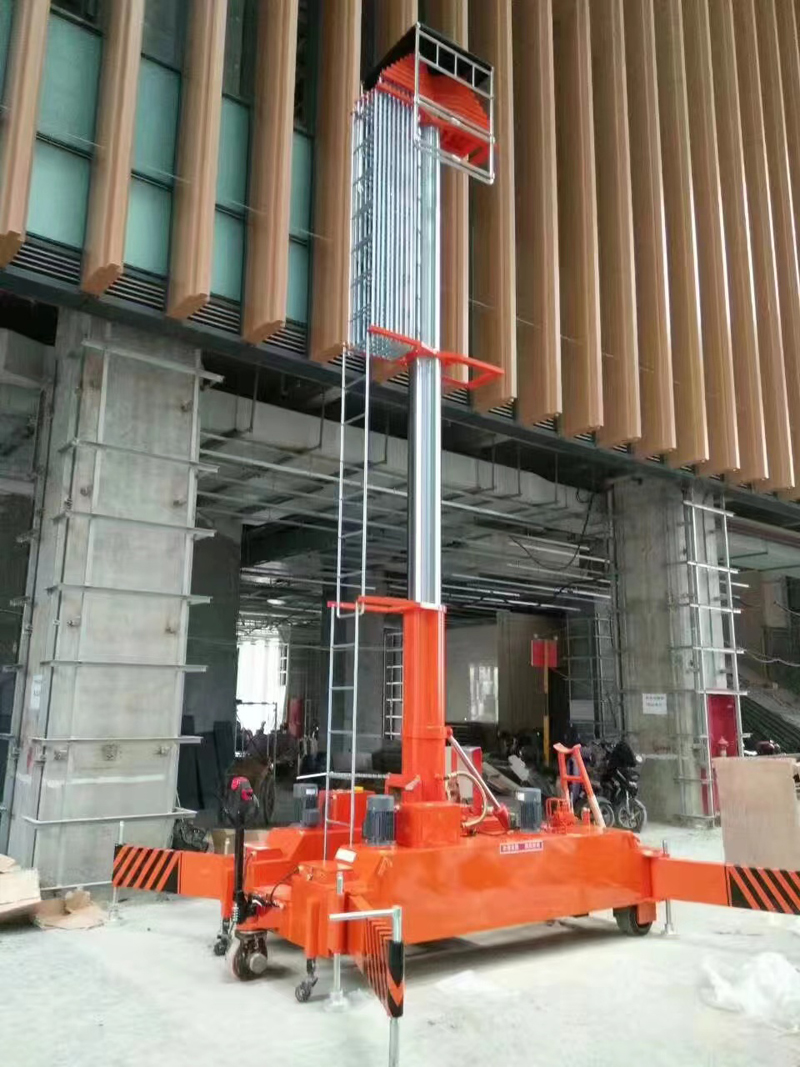 套缸式升降机有伸缩油缸直接顶升,当启动电机时,有电机带动齿轮泵供油,油液经单向阀及电磁通道输入油缸,伸缩油缸则逐节上升,当平台升到最大高度时系统压力也就达到了额定工作压力,此时有溢油阀卸荷,油压保持在恒定的工作压力,停机后单向阀保压,平台便停留在工作位置,平台可根据现场的作业高度在以下任意位置停留。