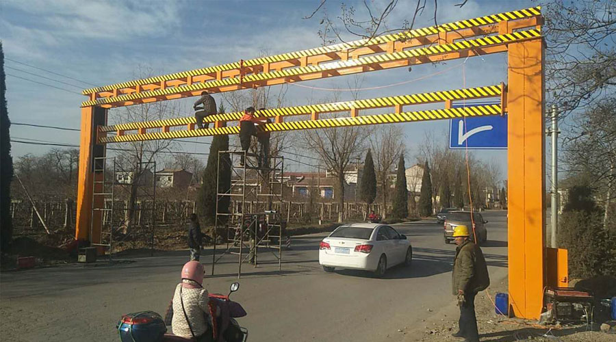 智能电动升降式限高架:公路龙门架、标志牌龙门架、简易龙门架、led显示屏龙门架,限宽龙门架,限高龙门架的安装指南:1.安装前确认是否通车,无通车时直接进场安装,通车时与甲方确认进场许可,封路时间及时段,以避开上下班高峰期,一般选择非节假日,凌晨6点安装为宜。进场后派员工一人先把基础墩清扫出来,把地脚螺栓包裹的丝牙清洁干净,用黄油把丝牙和螺母润化,把定位法兰处上的泥沙等清洁干净(注意:打扫的面积至少大于底法兰板的规格为宜),在确认安装地标无误时,依次把龙门架的部件从车上吊放在地上,请不要叠放,以平放组装方便为原则,派员工一名把显示屏龙门架的横臂与立柱连接高强螺栓按数量规格拿出来,还有配置的相关扳手等工具,合部件从车上吊下来后,首先把龙门架横臂放倒一侧(即正面安装LED显示屏一面朝上)然后把“左立柱”(记住:龙门架在基础混凝土浇筑时一般会有偏差,比如平行度和标高等。因此龙门架在制作前就要把立柱标记左立柱和右立柱,这样在运输和安装时才方便配单和装下货等)与横臂的左侧法兰连接起来,螺栓不要拧得太紧要有一定的松动,接下来再把“右立柱”连接固起来,这时把事先准备好的5吨至10吨相对量的钢丝绳和吊带准备好,穿过横臂的中间处,注意不要放得太近,吊车的吊钩与龙门架之间距离至少有3米以上为宜(这便于在高空作业时,吊车司机操作方便,视觉更好)再接下来吊车慢慢升起把整座公路龙门架吊起来,一般离地面500mm以内为宜,至到基础墩处时再提高即可,这中间安装人员用扳手拧住底加强筋处,让其不乱摆动,注意整个安装过程中需有一名安全指挥员,且每人配一个对讲机(肩负式,非手持式,这样利于作业),等标志牌龙门架底法兰全部与基础地脚螺栓笼对位后,迅速拧紧底法兰螺螺栓,这过程中吊车不能动直接吊放在原位,另一组安装公司用事先准备好的梯(7米左右即可)攀登到横臂处时拧紧横臂与立柱的法兰,注意一定要加双螺母,加弹簧垫,手工制作平垫,螺栓头在上部,全部检验无误后,上横臂把吊绳取下来,吊车复位,卫生清场,封路标识设备等撤离等!
