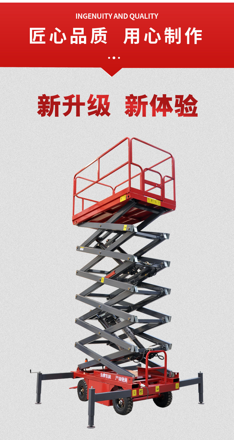 移动式高空作业平台是用途广泛的高空作业专用设备,它的剪叉式机械结构,使升降台起升后有较高的稳定性,宽大的作业平台和较高的承载能力,使高空作业范围更广,并适合多人同时作业。它使高空作业效率更高,安全更保障。