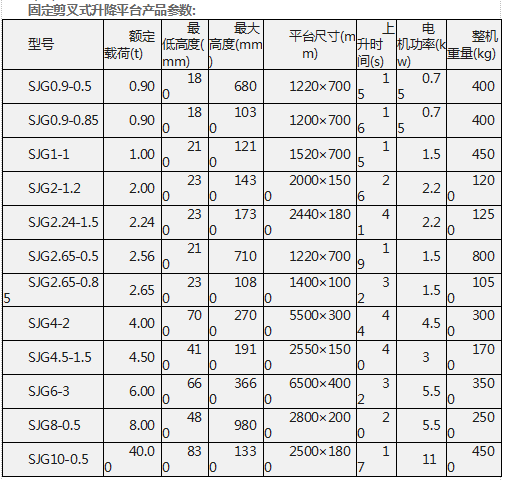 固定剪叉式升降平台主要用各种工作层间货物上下运送;立体车库和地下车库层高间汽车举升等。固定剪叉式升降平台液压系统设置防坠、超载安全保护装置,各楼层和升降机工作台面均可设置操作按钮,实现多点控制。产品结构坚固,承载量大,升降平稳,安装维护简单方便,是经济实用的低楼层间替代电梯的理想货物输送设备。根据升降平台的安装环境和使用要求,选择不同的可选配置,可取得更好的使用效果。